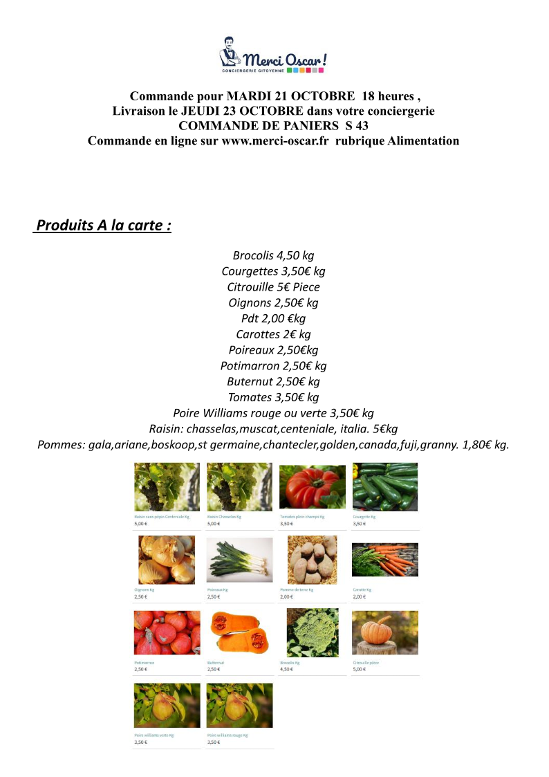 Vous pouvez commander jusqu'au mardi 12h, livraison le jeudi à la conciergerie.