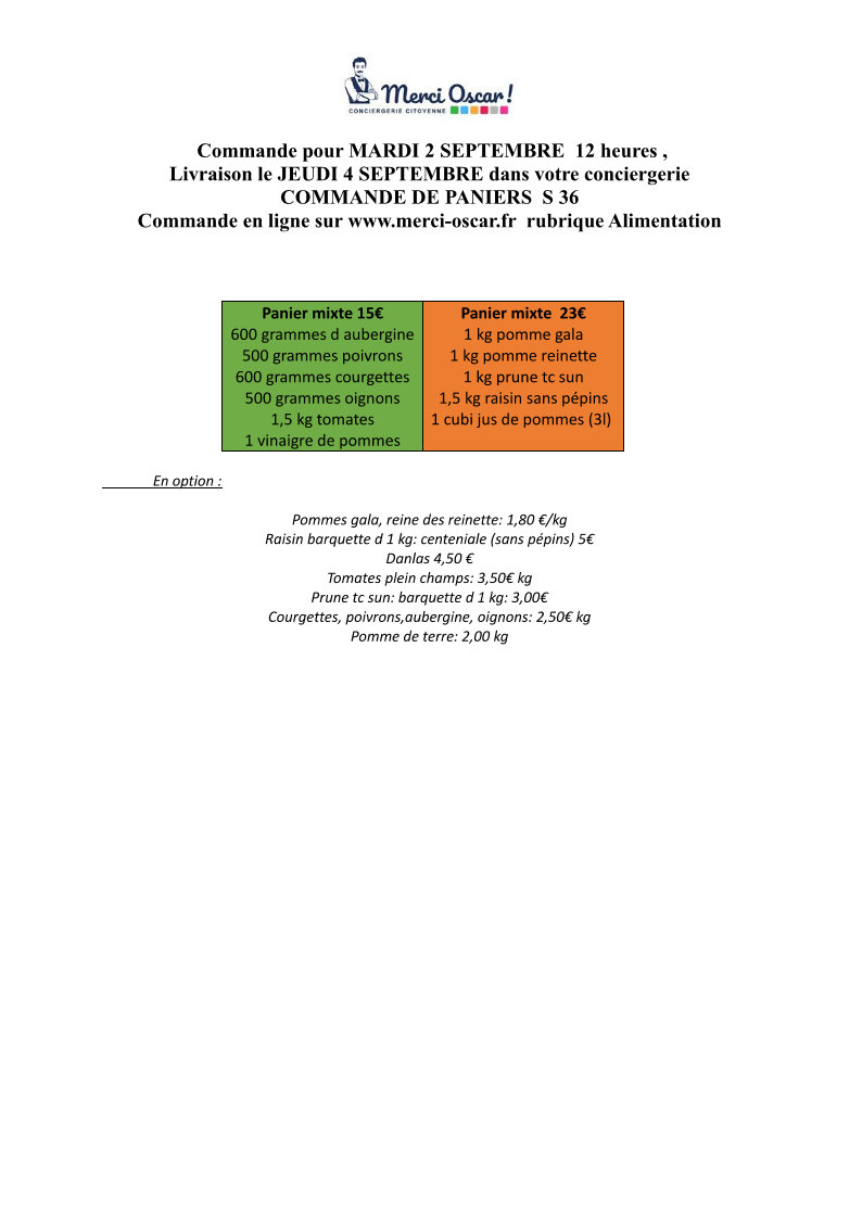 Commande du jeudi au MARDI 12h00. Livraison le jeudi matin entre 11h et 12h30 sur votre conciergerie.